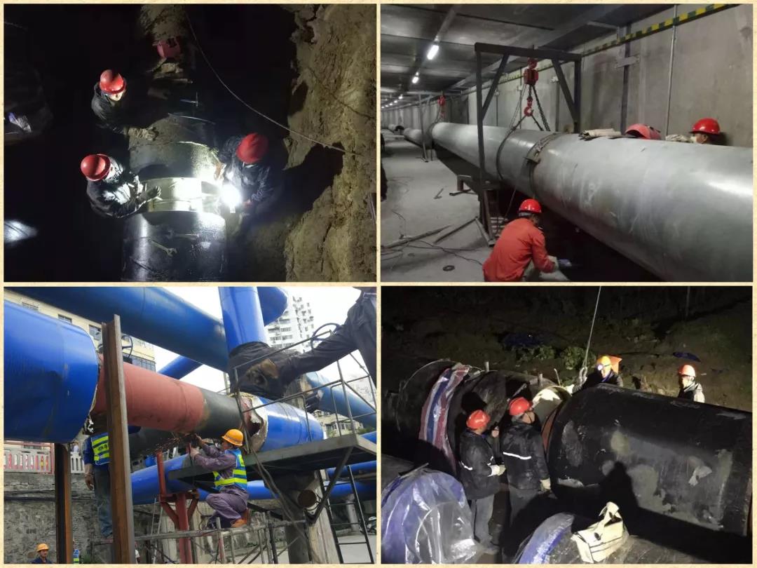 在施工高峰期,工地達到了500多人,建設者們翻山越嶺,過河穿橋,扎進管廊,他們開啟“5+2”、“白+黑”的工作模式,頂住酷暑寒冬,放棄節假日,一心一意只為盡快完成熱網建設,讓溫暖輸送到每一個用戶。遇到坡度達70多度的山坡施工,他們6人一組將200多公斤重的管道托架抬到現場,用手動滑輪倒鏈將3.3噸重的鋼管一點點拖拽上去。